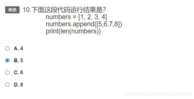 第十题,考察基本类型的内置函数。列表的append()函数是将参数当成一个整体添加至列表的末尾,列表长度总是+1的,于是输出列表的长度是5。