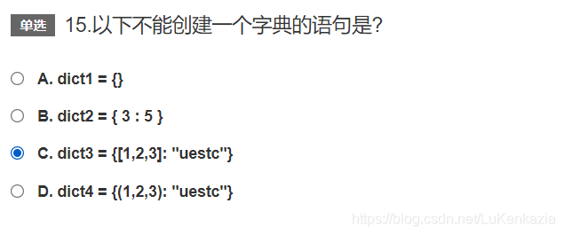 第十五题,字典中的键只能用不可变类型充当,C选项中的键是列表,列表是可变类型。