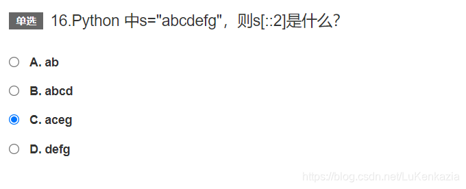 第十六题,容器类型的切片操作。s是字符串,s[::2]表示选取s从第一个字符开始,每隔两步(即一个字符)选取一次,最后选取结果是'aceg'。