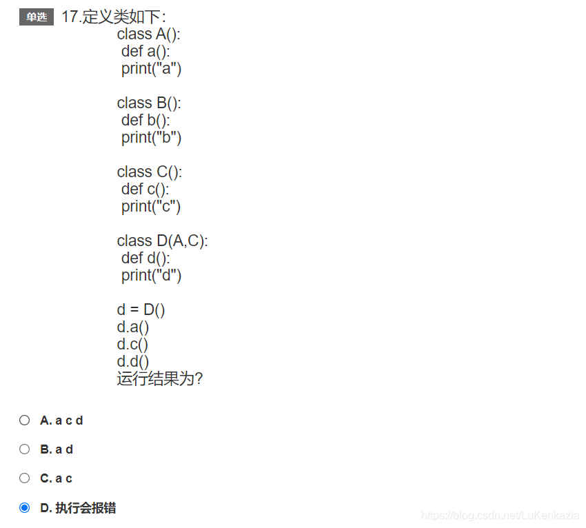 第十七题,考察的是类与对象。要注意的是,当通过对象调用方法时,会向方法传入自身这个参数,如果方法定义时没有self这个参数,则只能通过类名调用。题目中D类所拥有的a(),b(),c(),方法均没有参数,不能通过对象调用。
