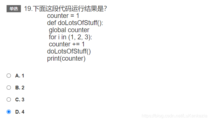 第十九题,主要考察作用域。global关键字将函数内的counter声明为全局变量,于是调用函数doLotsOfStuff()时会对第一句声明的counter产生影响。