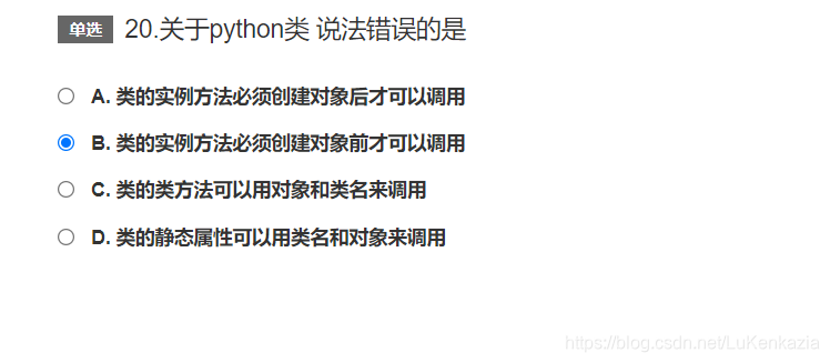第二十题,考察类与对象。实例方法是和对象密切相关的,每个对象调用的结果可能不一样,必须指定一个对象作为参数才能调用,所以实例方法必须在创建对象后才可以调用,B错误。