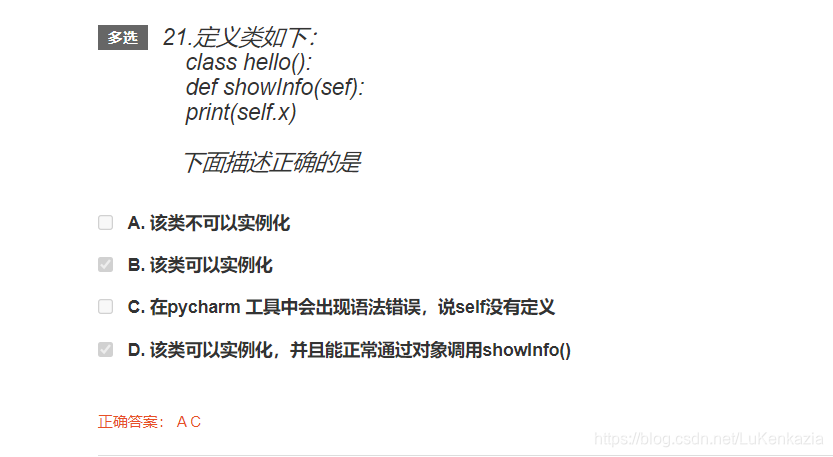 第二十一题,正确选项是AC。这题有点没搞懂,我不知道是不是出题人不小心把self打成了sef。如果写的是self的话,应该是可以实例化,然后再在类外给 对象.x 赋值的话是可以正常通过对象调用的。但如果写的就是sef的话,showInfo()方法内的self.x中的self就不会被认为是self指针了,所以pycharm会说self没有定义,类的定义中出现语法错误,也就不可以实例化了。