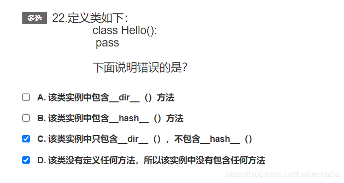 第二十二题,考察魔法方法。魔法方法是内置的方法,可以通过在类中重写增加新的行为,但是并不表示如果类中不定义的话就没有任何方法,类中是即包含__dir__()也包含__hash__()的。