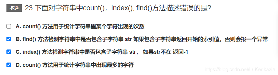 第二十三题,考察字符串类的内置方法。count()方法就是用于统计字符串中某个子字符串的出现次数。而find()方法和index()方法类似,都是查找子字符串的位置,如果找到就返回索引值,但是如果没有找到子字符串,find()会返回-1,index()会报错,选项BC是反了。