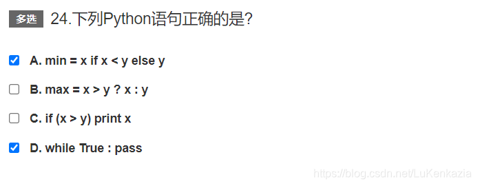 第二十四题,考察Python基本语法。A选项是用了三目运算符,是正确的。而B中的?在Python中没有定义。C选项中,如果用不是三目运算符的话,if(condition)后面要跟冒号,并且换行缩进,x放在print()小括号里面作为参数,这样才符合Python语法。D选项的语法是正确的,不过While循环体用Pass的话会无法跳出循环,程序会一直运行下去。