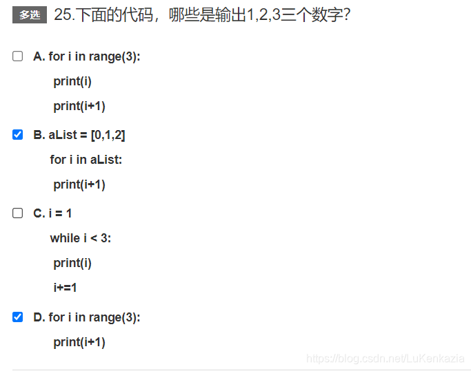 第二十五题。A选项中每次循环都会输出两个数字,最终输出结果是0,1,1,2,2,3。B选项明显正确。C选项只输出1,2,因为当i=3时 i<3的结果是False,会跳出循环,没有输出3。D选项也是正确的,range(3)生成包含0,1,2 三个数字的可迭代对象,输出时用print(i+1)是正确的。