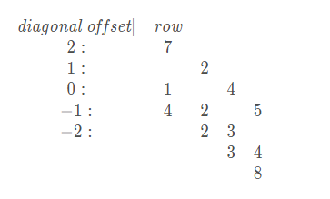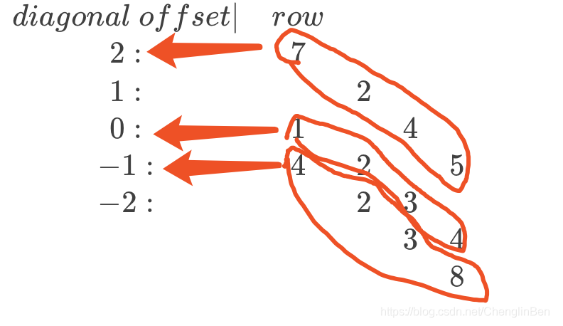 这样排列是按照:offsets中第一个元素与data第一行元素对应,并且按照data中第一行第一个元素为起始点,对角线排列。同理: