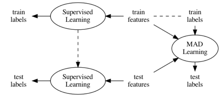 图1:常规监督学习和MAD学习的区别。 前者学习训练数据中从特征到标签的映射,并将该映射应用于测试数据,而后者学习数据之间的差异和关联,并从记忆的训练数据中推断测试标签。