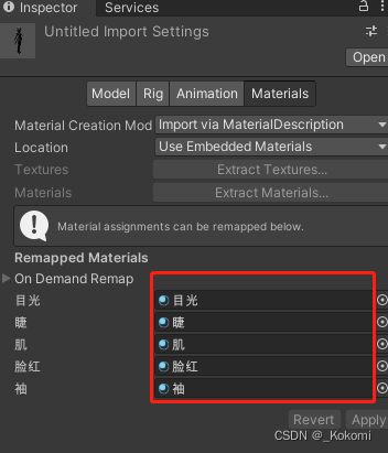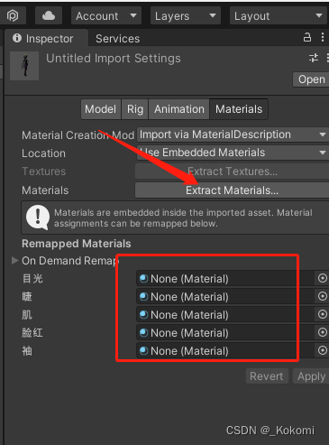 十一、正常导入后会如红框中显示的没有相关 材质,这时需要点击Extract Materials,之后会自动匹配上。