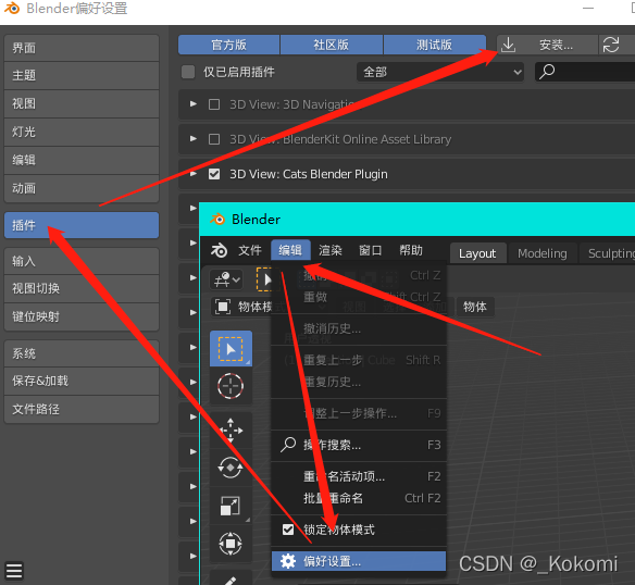 依次点击 编辑->偏好设置->插件->安装 选在刚才下好的插件压缩包进行安装。