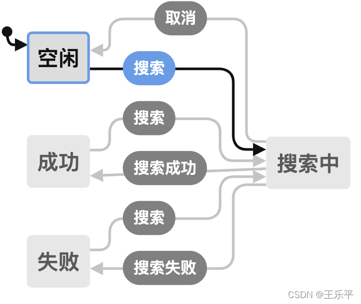 {initial: "空闲",states: {空闲:{on:{搜索: '搜索中'}},搜索中:{on:{搜索成功: '成功',搜索失败: '失败',取消: '空闲'}},成功:{on:{搜索: '搜索中'}},失败:{on:{搜索: '搜索中'}}},