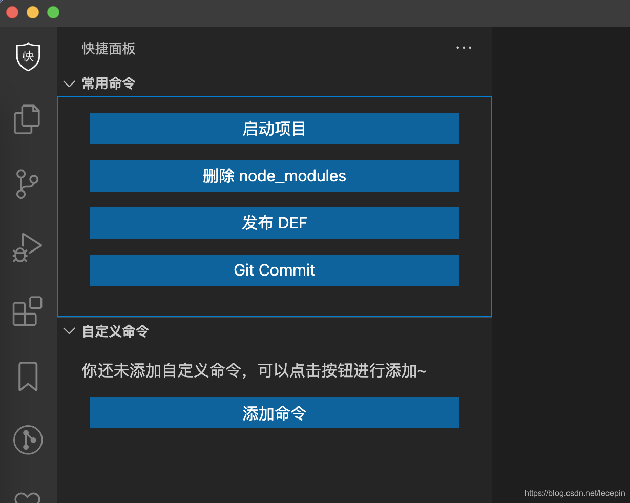 由于我用的是 VSCode 编辑器,而 VSCode 是支持写插件的,所以就可以写一个 VSCode 插件,做一个快捷面板的功能,把一些高频用到的命令直接放到快捷面板上,就可以避免上面遇到的问题了。