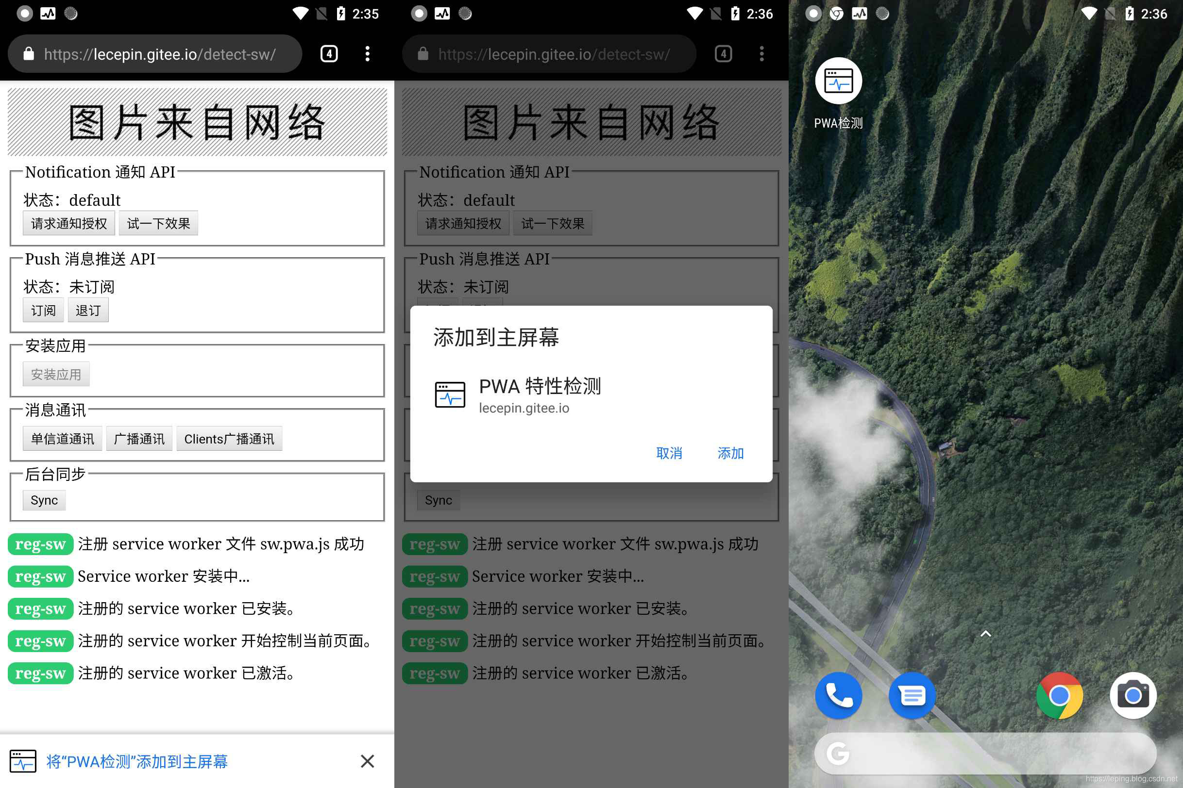 从 Chrome 68 以后,当满足安装应用的条件时,会立即在浏览器底部弹出 “Mini信息条”,用户单击信息条时,弹出“添加到主屏幕”的对话框,点击“添加”后,完成安装,此时页面上就出现在应用图标。