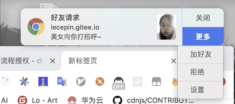 navigator.serviceWorker.ready.then(swReg => {Notification.requestPermission().then(() => {swReg.showNotification('好友请求', {body: '美女向你打招呼~',icon: 'https://img.alicdn.com/tfs/TB1qyPtU3HqK1RjSZFEXXcGMXXa-640-859.png',requireInteraction: true,actions: [{action: 'yes',title: '加好友',}, {action: 'no',title: '拒绝'}]});})
