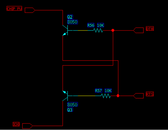 为解决该问题,几个月前已经计划使用国产芯片CH340来替换CH9102,功能和通讯速率是可以满足要求的。就是需要修改设计,而且之前批量加工的产品板也会浪费掉。简单梳理了有关项目中能使用到的串口功能,除了必要的串口收发引脚TXD和RXD信号以外,还是用了MODEM控制引脚DTR和RTS,只不过这里并不是用于真正的MODEM通讯,只是因为这2个信号脚可以通过串口软件当作普通输出引脚来用,也即GPO。这个功能和特性用在免按键串口下载电路和IO控制电路中比较普通。原电路: