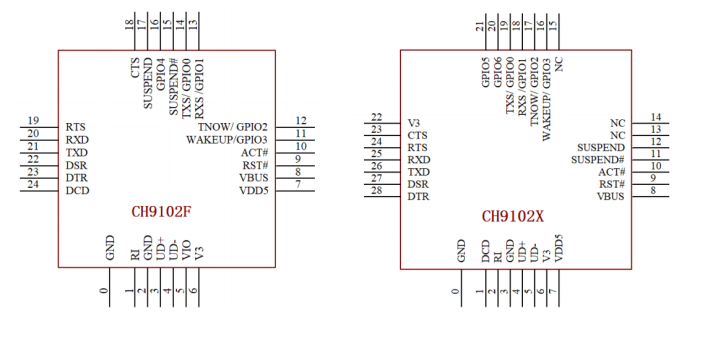 本来计划是和沁恒的技术支持沟通CH340和CP2102的应用差异点的,聊到了关于上面提到的CP芯片供应问题,哪想原来和CP2102/CP2014/CP2109引脚兼容的USB转高速串口芯片CH9102早已批量供应,很多与我们有同样经历的客户也导入了这颗物料。看了下手册,CH9102有2种封装,和CP芯片常用的QFN24和QFN28的封装都可以兼容,且串口波特率最高支持4Mbps。