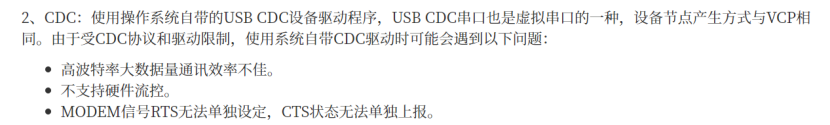 下面开始测试功能,串口收发功能验证通过,当进行串口免按键下载的时候发现下载会失败。咨询技术支持,是因为CH9102芯片支持多种驱动方式,默认上来直接使用的系统内置的CDC串口驱动,好处是免驱动安装应用方便,但是也有如下应用限制。这里就不展开描述了,需要了解具体差异的可以看该网站的说明:USB转串口方案 - 南京沁恒微电子股份有限公司