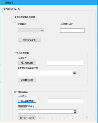 1、解压“signtool.zip”,运行“signtool.exe”,运行界面如下图18所示。工具有三块功能,最上边用于生成公私密钥对,中间用于对文件进行签名,最下边用于校验。