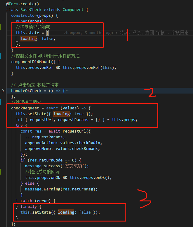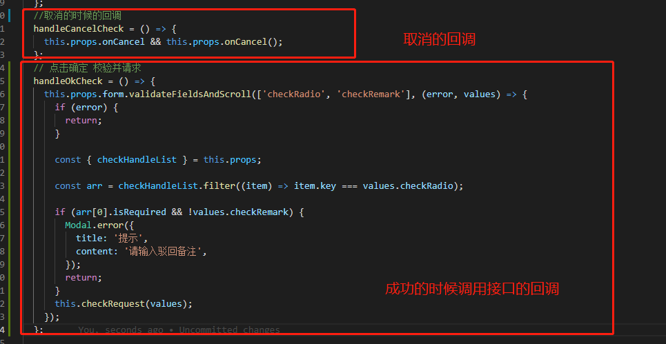 class BaseCheck extends Component {constructor(props) {super(props);//控制弹出框的开启this.state = {loading: false,};}//控制父组件可以调用子组件的方法componentDidMount() {this.props.onRef && this.props.onRef(this);}// 点击确定 校验并请求handleOkCheck = () => {this.props.form.validateFieldsAndScroll(['checkRadio', 'checkRemark'],