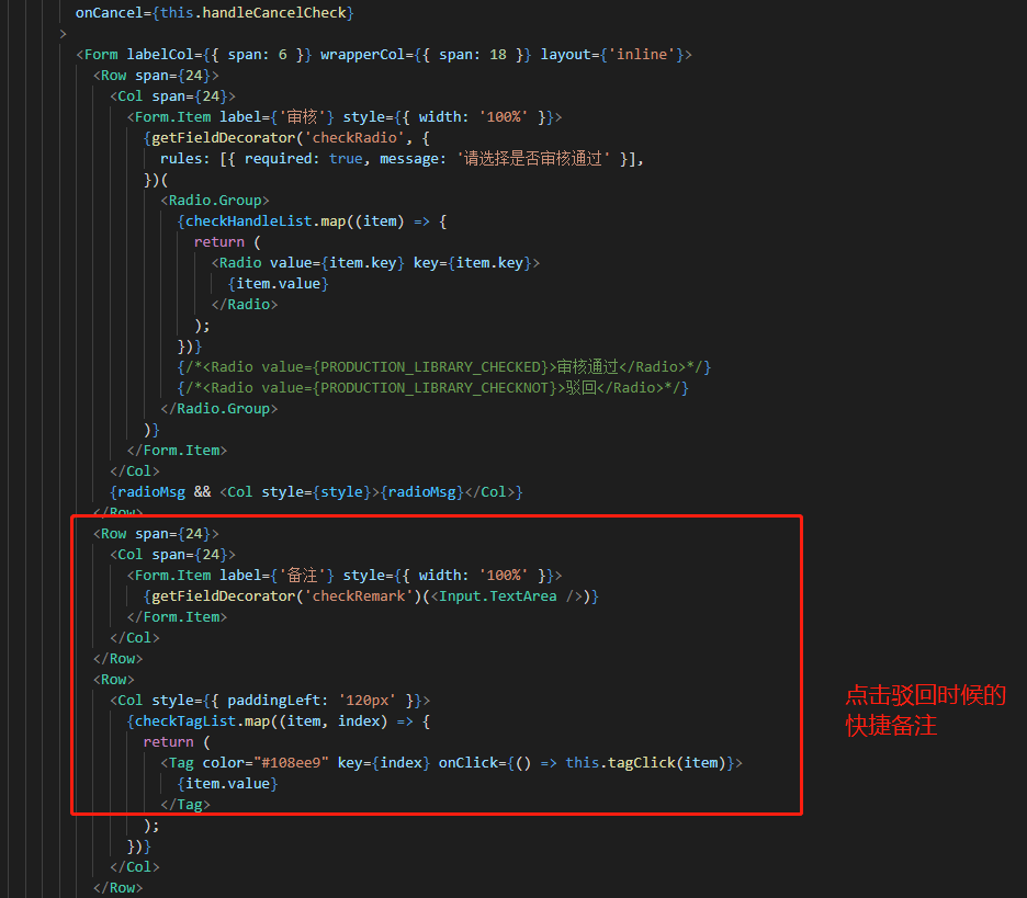 }>驳回</Radio>*/}</Radio.Group>)}</Form.Item></Col>{radioMsg && <Col style={style}>{radioMsg}</Col>}</Row><Row span={24}><Col span={24}><Form.Item label={'备注'} style={{ width: '100%' }}>{getFieldDecorator('checkRemark')(<Input.TextArea />)}</Form.Item></Col></Row><Row><Col style={{ paddingLeft: '120px' }}>{checkTagList.map((item, index) => {return (<Tag color="#108ee9" key={index} onClick={() =>this.tagClick(item)}>{item.value}</Tag>);})}</Col></Row></Form></Modal></Fragment>);}