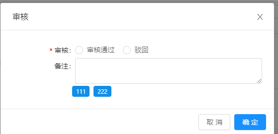 values.checkRadio);if (arr[0].isRequired && !values.checkRemark) {Modal.error({title: '提示',content: '请输入驳回备注',});return;}this.checkRequest(values);});};//处理接口请求checkRequest = async (values) => {this.setState({ loading: true });let { requestUrl, requestParams = {} } = this.props;try {const res = await requestUrl({...requestParams,approveAction: values.checkRadio,approveMemo: values.checkRemark,});if (res.returnCode == 0) {message.success('提交成功');//提交成功的回调this.props.onOk && this.props.onOk();} else {message.warning(res.returnMsg);}} catch (error) {} finally {this.setState({ loading: false });}};//取消的时候的回调handleCancelCheck = () => {this.props.onCancel && this.props.onCancel();};// 点击快捷备注标签tagClick = (item) => {this.props.form.setFieldsValue({checkRemark: item.value,});};// 初始化备注initRemarkFn = () => {this.props.form.setFieldsValue({checkRemark: '',});};render() {const {form: { getFieldDecorator },checkTagList = [],modalShow,checkHandleList = [],radioMsg,} = this.props;const style = {position: 'relative',top: '-20px',left: '120px',color: '#1890ff',};return (<Fragment><ModalmaskClosable={false}title="审核"visible={modalShow}width={550}onOk={this.handleOkCheck}onCancel={this.handleCancelCheck}><Form labelCol={{ span: 6 }} wrapperCol={{ span: 18 }}