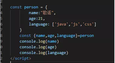 const person = {name:"歌谣",age:21,language: ['java','js','css']}const {name,age,language}=personconsole.log(name)console.log(age)console.log(language)