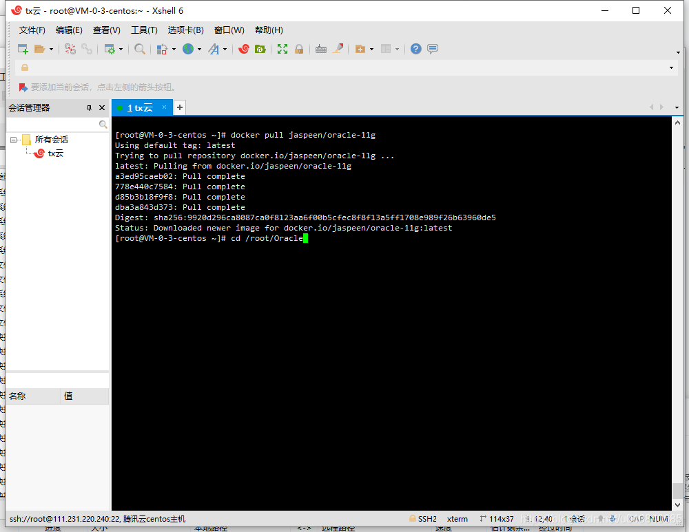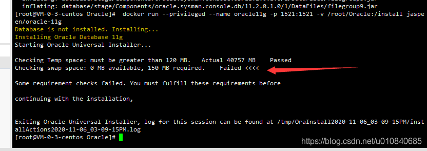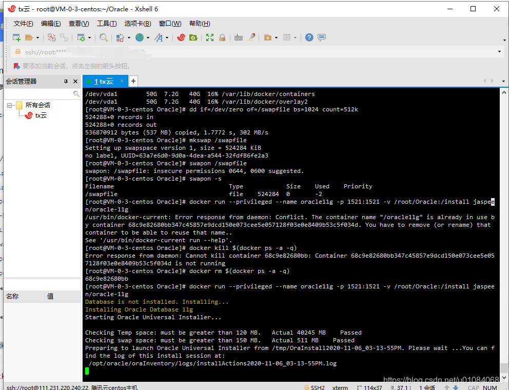 docker run --privileged --name oracle11g -p 1521:1521 -v <install_folder>:/install jaspeen/oracle-11g将<install_folder>替换为你解压出来的安装文件夹的目录比如我的是/root/Oracle那么久填/root/Oracledocker run --privileged --name oracle11g -p 1521:1521 -v /root/Oracle:/install jaspeen/oracle-11g