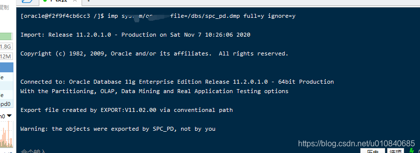 imp 帐号/密码 file=/dbs/spc_pd.dmp full=y ignore=y