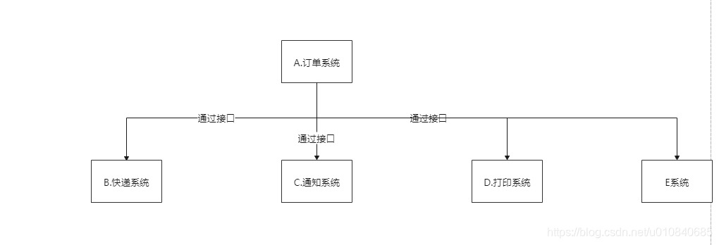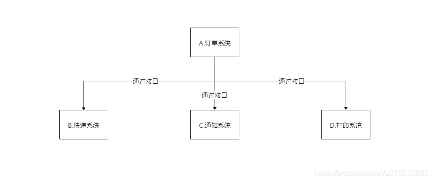 所以这个时候常规的操作是在A里面通过代码调用B,C ,D系统的接口来通知他们有新订单了