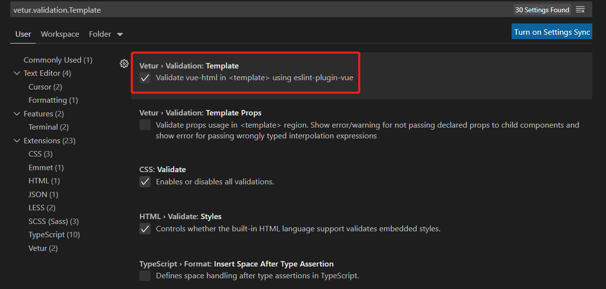 </div>2.我们可以更改vetur配置 :vscode文件(file)->首选项(preferences)->设置(settings)->搜索vetur.validation.Template,将这一项去掉该为false就可以了