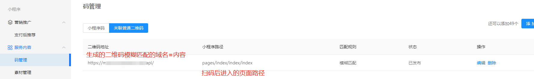 如果有测试环境,可以增加测试环境的地址;另外小程序码,还可以生成小程序对应页面的二维码(如:二维码进入我的钱包),供市场推广使用,配置可以参照下图: