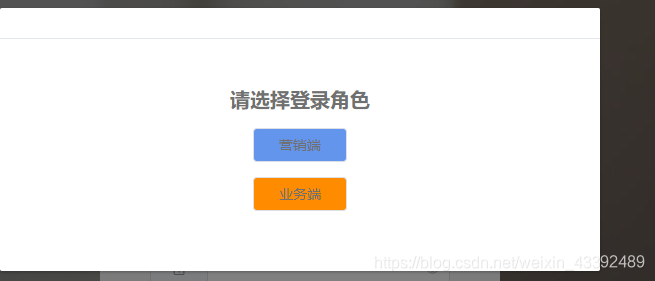 <div class="container" style="display: flex;flex-direction: column"><!-- <el-radio-group v-model="mode">--><div ><!-- <el-radio-button class="login-btn" label="0">营销端</el-radio-button>--><el-button class="login-btn" style="width: 94px;height: 34px;background-color: cornflowerblue" @click="confirm(0)">营销端</el-button></div><div><!--<el-radio-button class="login-btn" label="1">业务端</el-radio-button>--><el-button class="login-btn" style="margin-top: 15px;width: 94px;height: 34px;background-color: darkorange" @click="confirm(1)">业务端</el-button></div><!-- </el-radio-group>-->