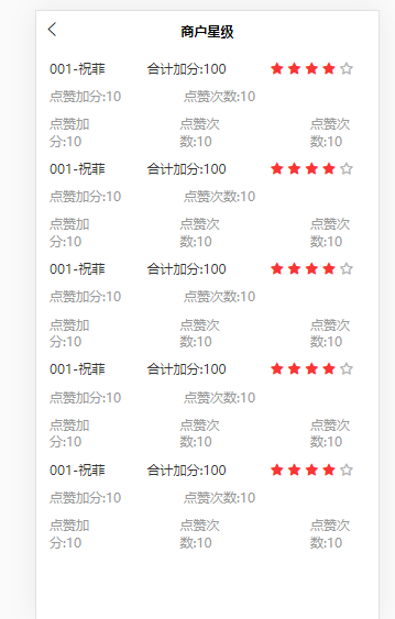 <template><view ><view v-for="(item,index) in 5"><view  style="display: flex;padding: 24rpx 0 0 30rpx;"><text style="font-size: 30rpx;color: #333333;">001-祝菲</text><text style="margin-left:94rpx;font-size: 30rpx;color: #333333;">合计加分:100</text><u-rate :count="count" v-model="value" style="margin-left:94rpx;font-size: 30rpx;color: #333333;"></u-rate></view><view style="display: flex;padding: 24rpx 0 0 30rpx;"><text style="font-size: 30rpx;color: #999999;">点赞加分:10</text><text style="margin-left: 138rpx;font-size: 30rpx;color: #999999;">点赞次数:10</text></view><view style="display: flex;padding: 24rpx 0 0 30rpx;"><text style="font-size: 30rpx;color: #999999;">点赞加分:10</text><text style="margin-left: 138rpx;font-size: 30rpx;color: #999999;">点赞次数:10</text><text style="margin-left: 138rpx;font-size: 30rpx;color: #999999;">点赞次数:10</text></view></view></view>