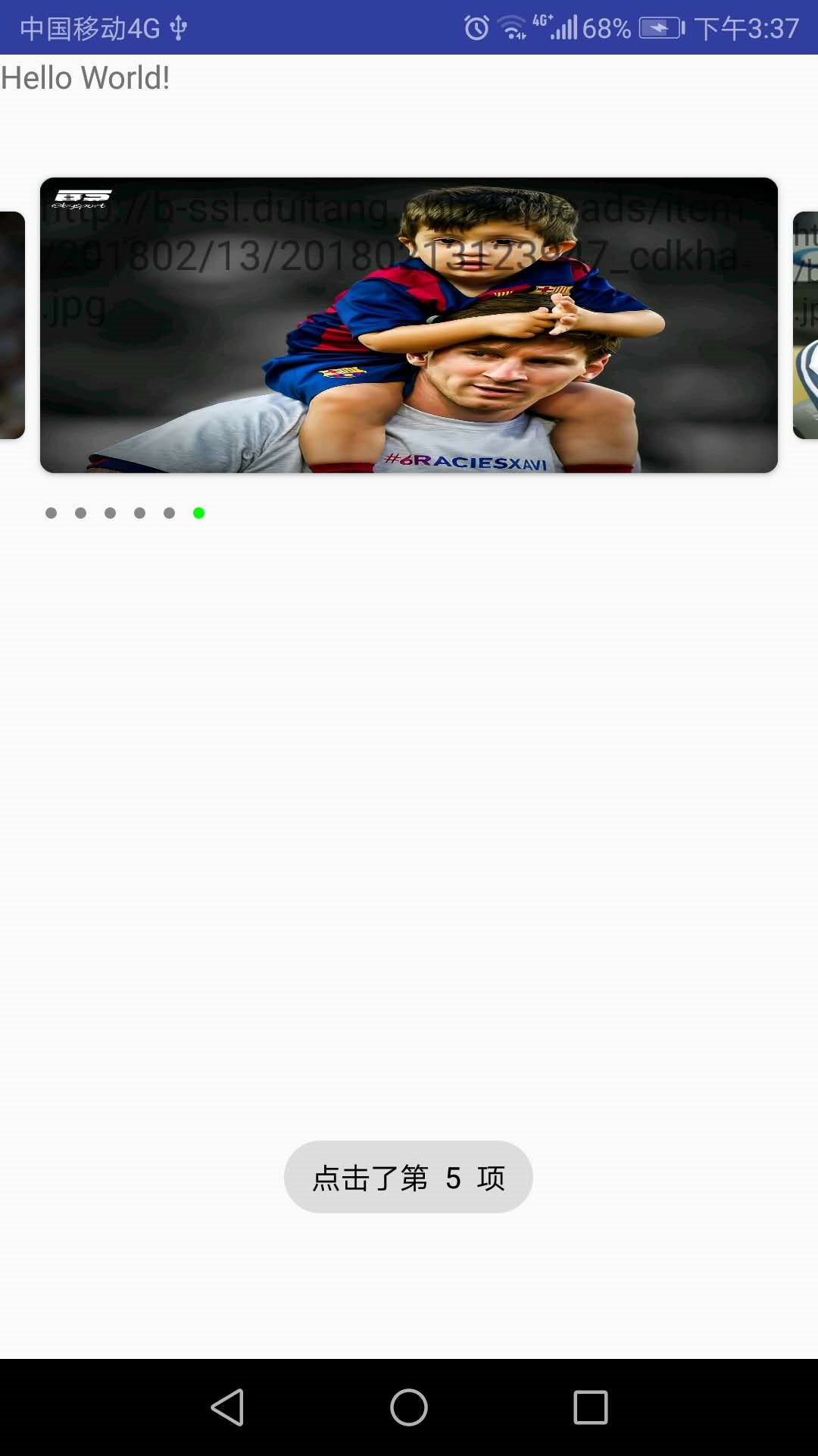 public class MainActivity extends AppCompatActivity {@Overrideprotected void onCreate(Bundle savedInstanceState) {super.onCreate(savedInstanceState);setContentView(R.layout.activity_main);BannerLayout recyclerBanner = findViewById(R.id.recycler);List<String> list = new ArrayList<>();list.add("http://ww1.sinaimg.cn/large/b7cd25cagw1f55lgujsvuj20qo0z1n2o.jpg");list.add("http://b-ssl.duitang.com/uploads/item/201802/13/20180213092931_vlmdh.jpg");list.add("http://p2.qhimgs4.com/t010eb5908d6f28cf14.jpg");list.add("http://b-ssl.duitang.com/uploads/item/201802/13/20180213124050_gkhxt.jpg");list.add("http://dingyue.nosdn.127.net/3tqSsnfhfRRea6kZVlS0reiWcPFx9SR1jJ=cHkyEJLREO1530066845542compressflag.jpg");list.add("http://b-ssl.duitang.com/uploads/item/201802/13/20180213123947_cdkha.jpg");WebBannerAdapter webBannerAdapter=new WebBannerAdapter(this,list);webBannerAdapter.setOnBannerItemClickListener(new BannerLayout.OnBannerItemClickListener() {@Overridepublic void onItemClick(int position) {Toast.makeText(MainActivity.this, "点击了第 " + position+" 项", Toast.LENGTH_SHORT).show();}});recyclerBanner.setAdapter(webBannerAdapter);}