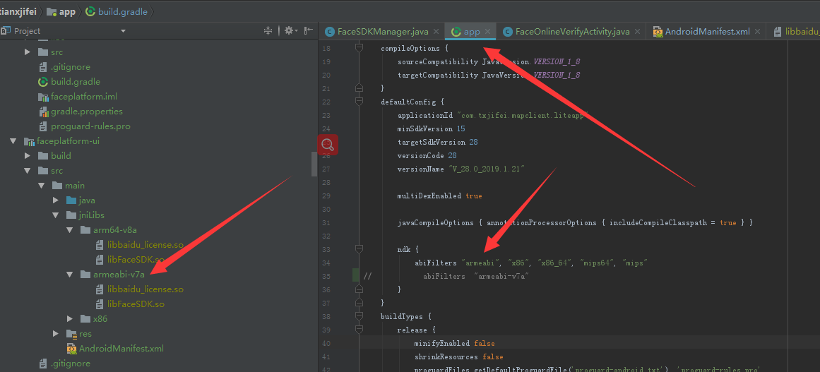 根据build.gradle文件里面的ndk配置,修改jniLibs文件夹下面的so文件夹名称即可