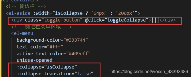 通过点击一个按钮,让侧边栏进行展开与折叠。通过 isCollapse 的值来动态变化侧边栏的宽度。