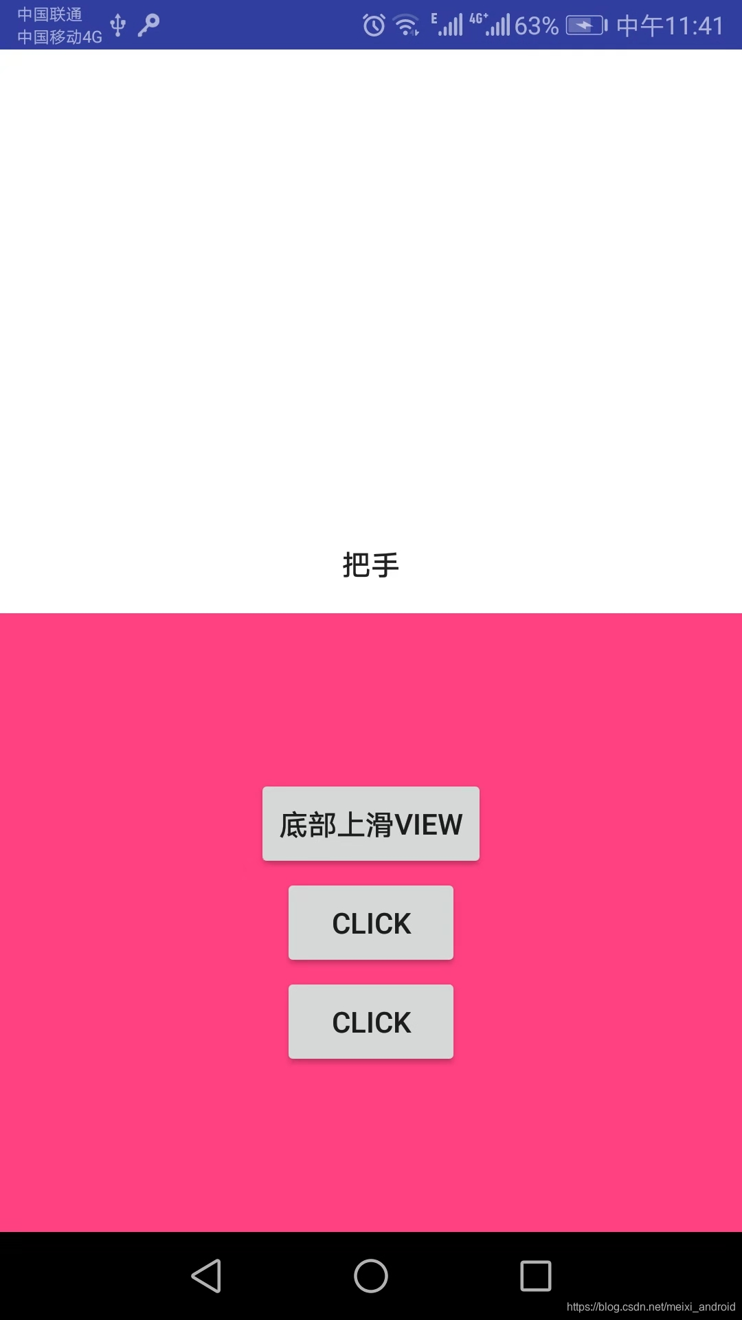 <?xml version="1.0" encoding="utf-8"?> <com.example.lenovo.drawerlibrary.DrawerLayout xmlns:android="http://schemas.android.com/apk/res/android"xmlns:drawer="http://schemas.android.com/apk/res-auto"android:id="@+id/dial_drawer"android:layout_width="fill_parent"android:layout_height="fill_parent"android:background="#ffffff"drawer:DrawerLayoutContent_ID="@+id/drawerContent"drawer:DrawerLayoutHandler_ID="@+id/drawerHandle"drawer:DrawerLayout_ID="@+id/drawer2"><RelativeLayoutandroid:id="@+id/drawer2"android:layout_width="fill_parent"android:layout_height="wrap_content"android:layout_alignParentBottom="true"><Buttonandroid:id="@+id/drawerHandle"android:layout_width="match_parent"android:layout_height="wrap_content"android:layout_centerHorizontal="true"android:background="@color/transparent"android:text="把手"/><LinearLayoutandroid:id="@+id/drawerContent"android:layout_width="fill_parent"android:layout_height="300dp"android:layout_below="@+id/drawerHandle"android:background="@color/colorAccent"android:gravity="center"android:orientation="vertical"><Buttonandroid:id="@+id/click"android:layout_width="wrap_content"android:layout_height="wrap_content"android:layout_gravity="center"android:text="底部上滑view" /><Buttonandroid:id="@+id/click1"android:layout_width="wrap_content"android:layout_height="wrap_content"android:layout_gravity="center"android:text="click" /><Buttonandroid:id="@+id/click2"android:layout_width="wrap_content"android:layout_height="wrap_content"android:layout_gravity="center"android:text="click" /></LinearLayout></RelativeLayout></com.example.lenovo.drawerlibrary.DrawerLayout>