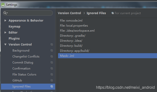 这里设置提交svn时的忽略文件,忽略文件也就是不需要提交的文件,如果提交上去,可能会与本地文件发生冲突。Ignore specified file忽略文件Ignore all files under忽略指定文件Ignore all files matching忽略指定匹配规则文件