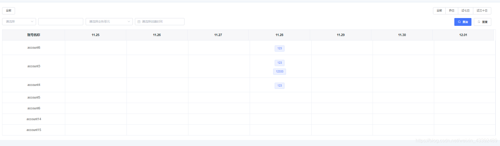 <!-- <el-table-column label="id" prop="1" align="center"></el-table-column>--><!--渲染账号名称--><el-table-column label="账号名称" prop="name" align="center"></el-table-column><!--渲染时间--><el-table-column align="center" v-for="item in time" :label="item" :prop="item"><!--渲染表格里面的数据--><template slot-scope="scope"><el-popover trigger="hover" placement="top" v-for="(row,index) in scope.row[item]" :key="index"><p>任务名称: {{ row.name }}</p><p>发布时间: {{ row.start_time }}</p><p>任务状态: {{ row.status_name }}</p><div slot="reference" class="name-wrapper" style="margin-top: 10px"><el-tag size="medium">{{ row.name }}</el-tag></div></el-popover></template></el-table-column></el-table>