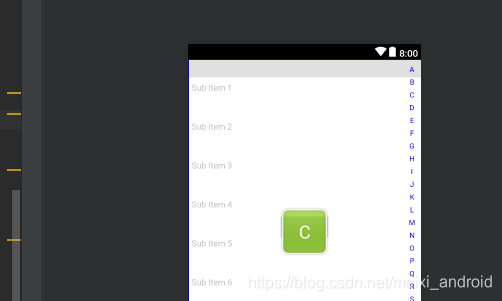 /*** 作者:created by meixi* 邮箱:13164716840@163.com* 日期:2018/11/23 15*/public class SideBar extends View {// 触摸事件private OnTouchingLetterChangedListener onTouchingLetterChangedListener;// 26个字母public static String[] b = {"A", "B", "C", "D", "E", "F", "G", "H", "I","J", "K", "L", "M", "N", "O", "P", "Q", "R", "S", "T", "U", "V","W", "X", "Y", "Z", "#"};private int choose = -1;// 选中private Paint paint = new Paint();private TextView mTextDialog;private Context mContext;/*** 为SideBar设置显示字母的TextView** @param mTextDialog*/public void setTextView(TextView mTextDialog) {this.mTextDialog = mTextDialog;}public SideBar(Context context, AttributeSet attrs, int defStyle) {super(context, attrs, defStyle);mContext = context;}public SideBar(Context context, AttributeSet attrs) {super(context, attrs);mContext = context;}public SideBar(Context context) {super(context);mContext = context;}/*** 重写这个方法*/protected void onDraw(Canvas canvas) {super.onDraw(canvas);// 获取焦点改变背景颜色.int height = getHeight();// 获取对应高度int width = getWidth(); // 获取对应宽度int singleHeight = height / b.length;// 获取每一个字母的高度for (int i = 0; i < b.length; i++) {paint.setColor(getResources().getColor(R.color.side_bar_text));paint.setColor(Color.BLUE);paint.setTypeface(Typeface.DEFAULT);paint.setAntiAlias(true);paint.setTextSize(dip2px(mContext, 12));// 选中的状态if (i == choose) {paint.setColor(getResources().getColor(R.color.colorPrimaryDark));paint.setFakeBoldText(true);}// x坐标等于中间-字符串宽度的一半.float xPos = width / 2 - paint.measureText(b[i]) / 2;float yPos = singleHeight * i + singleHeight;canvas.drawText(b[i], xPos, yPos, paint);paint.reset();// 重置画笔}}@Overridepublic boolean dispatchTouchEvent(MotionEvent event) {final int action = event.getAction();final float y = event.getY();// 点击y坐标final int oldChoose = choose;final OnTouchingLetterChangedListener listener = onTouchingLetterChangedListener;final int c = (int) (y / getHeight() * b.length);// 点击y坐标所占总高度的比例*b数组的长度就等于点击b中的个数.switch (action) {case MotionEvent.ACTION_UP:setBackgroundDrawable(new ColorDrawable(0x00000000));choose = -1;//invalidate();if (mTextDialog != null) {mTextDialog.setVisibility(View.INVISIBLE);}break;default:setBackgroundResource(R.drawable.sidebar_background);if (oldChoose != c) {if (c >= 0 && c < b.length) {if (listener != null) {listener.onTouchingLetterChanged(b[c]);}if (mTextDialog != null) {mTextDialog.setText(b[c]);mTextDialog.setVisibility(View.VISIBLE);}choose = c;invalidate();}}break;}return true;}/*** 向外公开的方法** @param onTouchingLetterChangedListener*/public void setOnTouchingLetterChangedListener(OnTouchingLetterChangedListener onTouchingLetterChangedListener) {this.onTouchingLetterChangedListener = onTouchingLetterChangedListener;}/*** 接口** @author coder*/public interface OnTouchingLetterChangedListener {public void onTouchingLetterChanged(String s);}public static int dip2px(Context context, float dpValue) {final float scale = context.getResources().getDisplayMetrics().density;return (int) (dpValue * scale + 0.5f);}