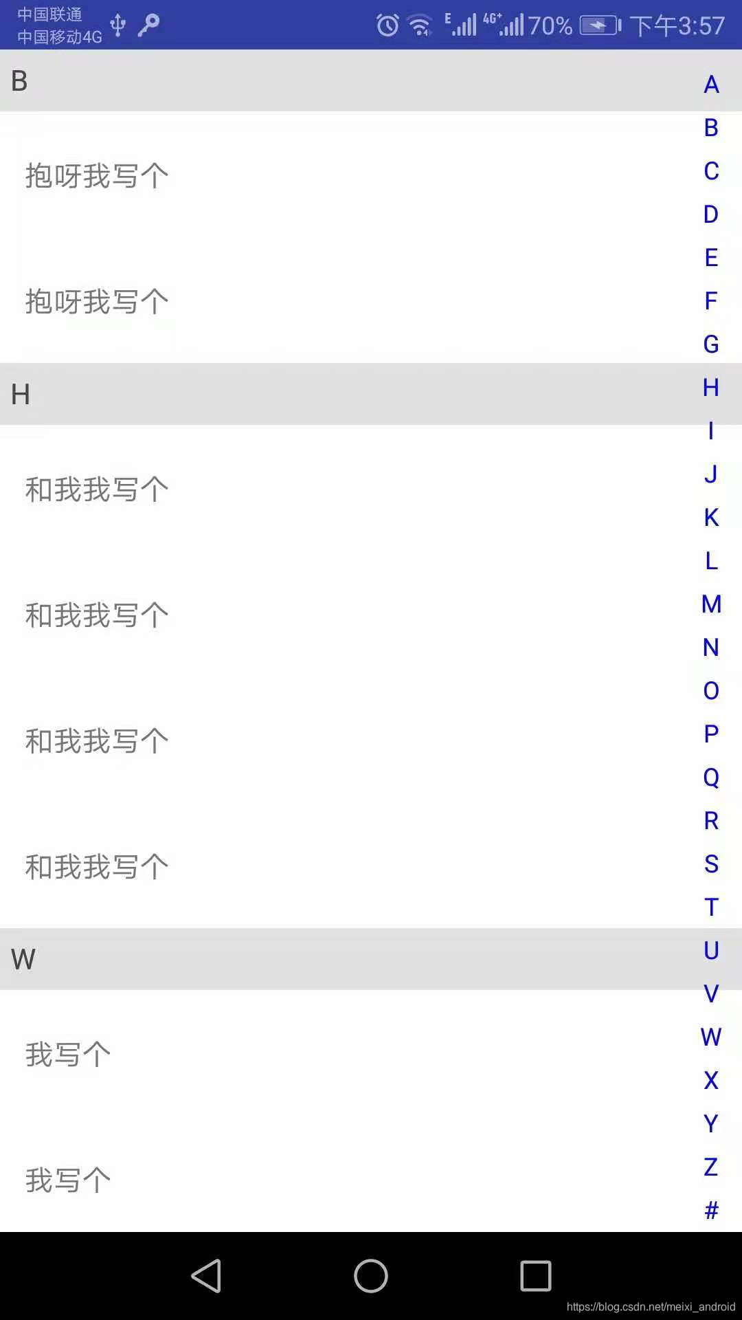 public class MyABCD extends Activity {private ListView sortListView;private SideBar sideBar;private TextView dialog;private TextView title;private LinearLayout titleLayout;private SortGroupMemberAdapter adapter;private List<GroupMemberBean> mSortList = new ArrayList<GroupMemberBean>();/*** 汉字转换成拼音的类*/private CharacterParser characterParser;/*** 根据拼音来排列ListView里面的数据类*/private PinyinComparator pinyinComparator;/*** 上次第一个可见元素,用于滚动时记录标识。*/private int lastFirstVisibleItem = -1;@Overrideprotected void onCreate(Bundle savedInstanceState) {super.onCreate(savedInstanceState);setContentView(R.layout.abcdefg);characterParser = CharacterParser.getInstance();//字符解析器pinyinComparator = new PinyinComparator();//汉语拼音getdata();initview();}public void getdata(){for (int i=0;i<9;i++){GroupMemberBean bean23347 = new GroupMemberBean();bean23347.setName("我写个");String pinyin23347 = characterParser.getSelling("我写个");String sortString23347 = pinyin23347.substring(0, 1).toUpperCase();if (sortString23347.matches("[A-Z]")) {bean23347.setSortLetters(sortString23347.toUpperCase());} else {bean23347.setSortLetters("#");}mSortList.add(bean23347);}}public void initview(){sortListView =(ListView)findViewById(R.id.listaa);sideBar = (SideBar)findViewById(R.id.sidebar);dialog = (TextView)findViewById(R.id.floating_header);titleLayout = (LinearLayout)findViewById(R.id.title_layout);//标题title = (TextView)findViewById(R.id.title_layout_catalog);//标题adapter = new SortGroupMemberAdapter(MyABCD.this, mSortList);sortListView.setAdapter(adapter);adapter.notifyDataSetChanged();Collections.sort(mSortList, pinyinComparator);//排列sideBar.setTextView(dialog);sideBar.setOnTouchingLetterChangedListener(new SideBar.OnTouchingLetterChangedListener() {//右边的abcd@Overridepublic void onTouchingLetterChanged(String s) {// 该字母首次出现的位置int position = adapter.getPositionForSection(s.charAt(0));if (position != -1) {sortListView.setSelection(position);}}});sortListView.setOnItemClickListener(new AdapterView.OnItemClickListener() {@Overridepublic void onItemClick(AdapterView<?> parent, View view,int position, long id) {// 这里要利用adapter.getItem(position)来获取当前position所对应的对象Toast.makeText(MyABCD.this,"ss"+position,Toast.LENGTH_SHORT).show();}});sortListView.setOnScrollListener(new AbsListView.OnScrollListener() {//上推标题。可用可不用@Overridepublic void onScrollStateChanged(AbsListView view, int scrollState) {}@Overridepublic void onScroll(AbsListView view, int firstVisibleItem, int visibleItemCount, int totalItemCount) {if (mSortList.size() > 1) {int section = getSectionForPosition(firstVisibleItem);int nextSection = getSectionForPosition(firstVisibleItem + 1);int nextSecPosition = getPositionForSection(+nextSection);if (firstVisibleItem != lastFirstVisibleItem) {ViewGroup.MarginLayoutParams params = (ViewGroup.MarginLayoutParams) titleLayout.getLayoutParams();params.topMargin = 0;titleLayout.setLayoutParams(params);title.setText(mSortList.get(getPositionForSection(section)).getSortLetters());}if (nextSecPosition == firstVisibleItem + 1) {View childView = view.getChildAt(0);if (childView != null) {int titleHeight = titleLayout.getHeight();int bottom = childView.getBottom();ViewGroup.MarginLayoutParams params = (ViewGroup.MarginLayoutParams) titleLayout.getLayoutParams();if (bottom < titleHeight) {float pushedDistance = bottom - titleHeight;params.topMargin = (int) pushedDistance;titleLayout.setLayoutParams(params);} else {if (params.topMargin != 0) {params.topMargin = 0;titleLayout.setLayoutParams(params);}}}}lastFirstVisibleItem = firstVisibleItem;}}});}/*** 根据ListView的当前位置获取分类的首字母的Char ascii值*/public int getSectionForPosition(int position) {return mSortList.get(position).getSortLetters().charAt(0);}/*** 根据分类的首字母的Char ascii值获取其第一次出现该首字母的位置*/public int getPositionForSection(int section) {for (int i = 0; i < mSortList.size(); i++) {String sortStr = mSortList.get(i).getSortLetters();char firstChar = sortStr.toUpperCase().charAt(0);if (firstChar == section) {return i;}}return -1;}