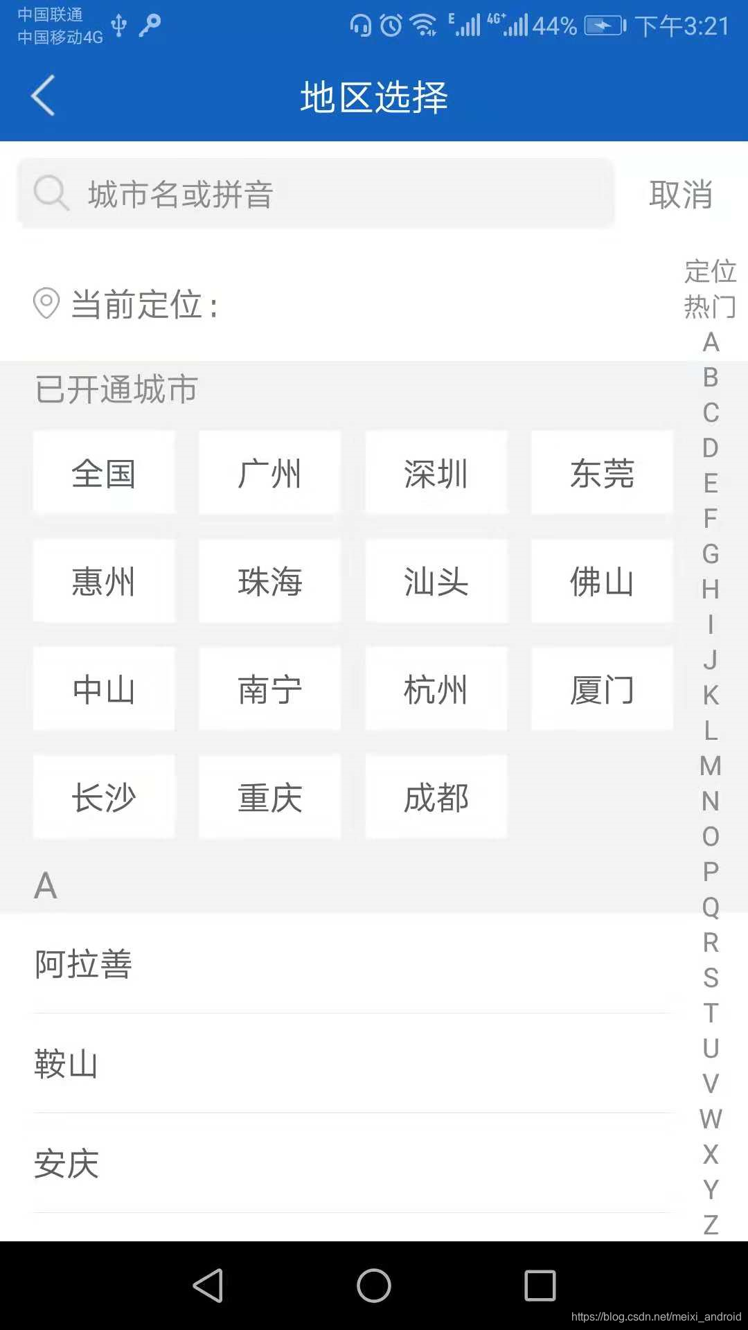 public class MainActivity extends AppCompatActivity {TextView textView;private static final int REQUEST_CODE_PICK_CITY = 0;@Overrideprotected void onCreate(Bundle savedInstanceState) {super.onCreate(savedInstanceState);setContentView(R.layout.activity_main);textView = findViewById(R.id.ssssss);textView.setOnClickListener(new View.OnClickListener() {@Overridepublic void onClick(View view) {startActivityForResult(new Intent(MainActivity.this, CityPickerActivity.class),REQUEST_CODE_PICK_CITY);}});}//返回选中城市@Overridepublic void onActivityResult(int requestCode, int resultCode, Intent data) {if (requestCode == REQUEST_CODE_PICK_CITY && resultCode == RESULT_OK){if (data != null){String city = data.getStringExtra(CityPickerActivity.KEY_PICKED_CITY);
