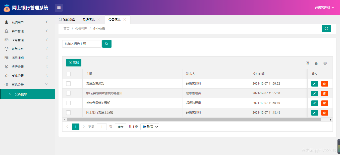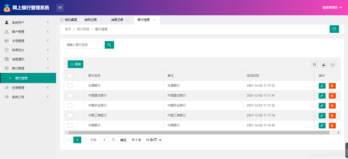 使用java+springboot+mysql开发的银行管理系统,系统包含超级管理员、管理员、客户角色,功能如下:
