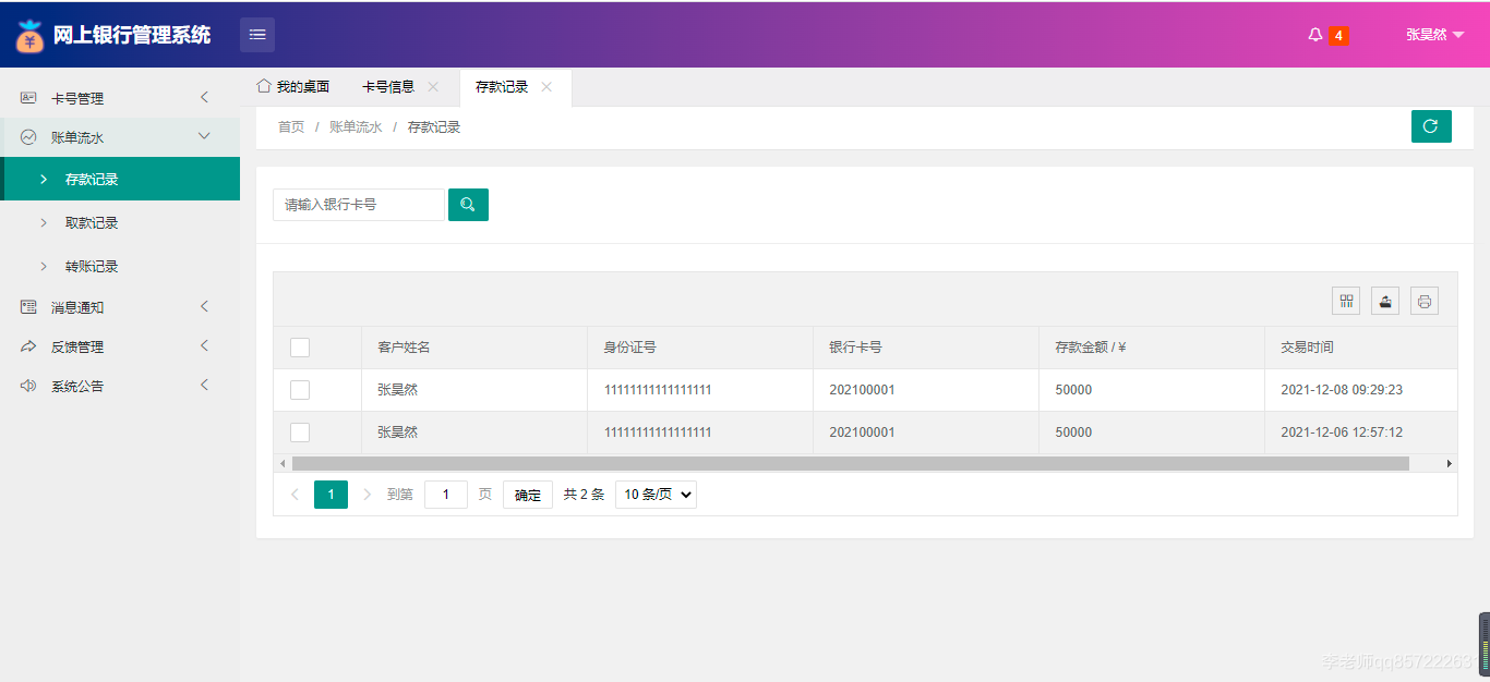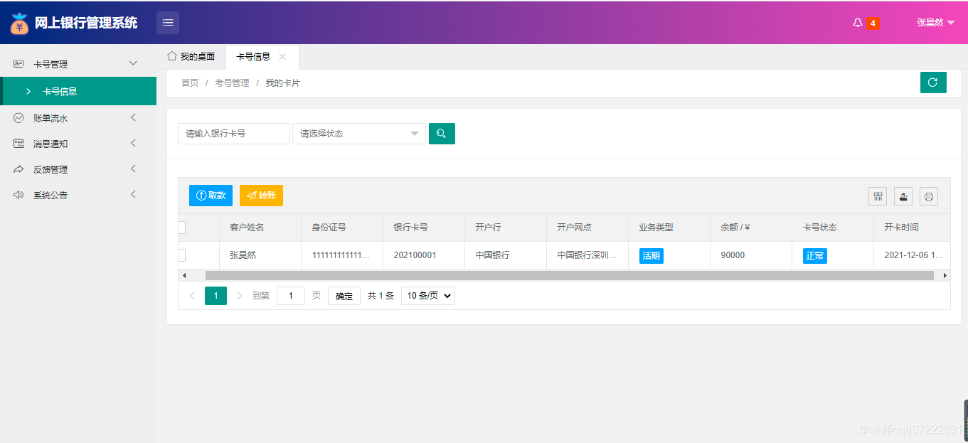 客户(用户):卡号管理;账单流水;消息通知;反馈管理;系统公告;顶部还可以收到消息通知(动账提醒);修改个人信息;修改密码;银行卡盈余统计曲线图;