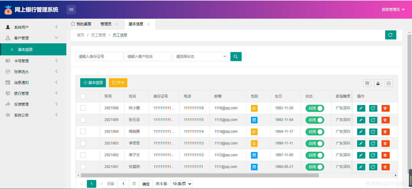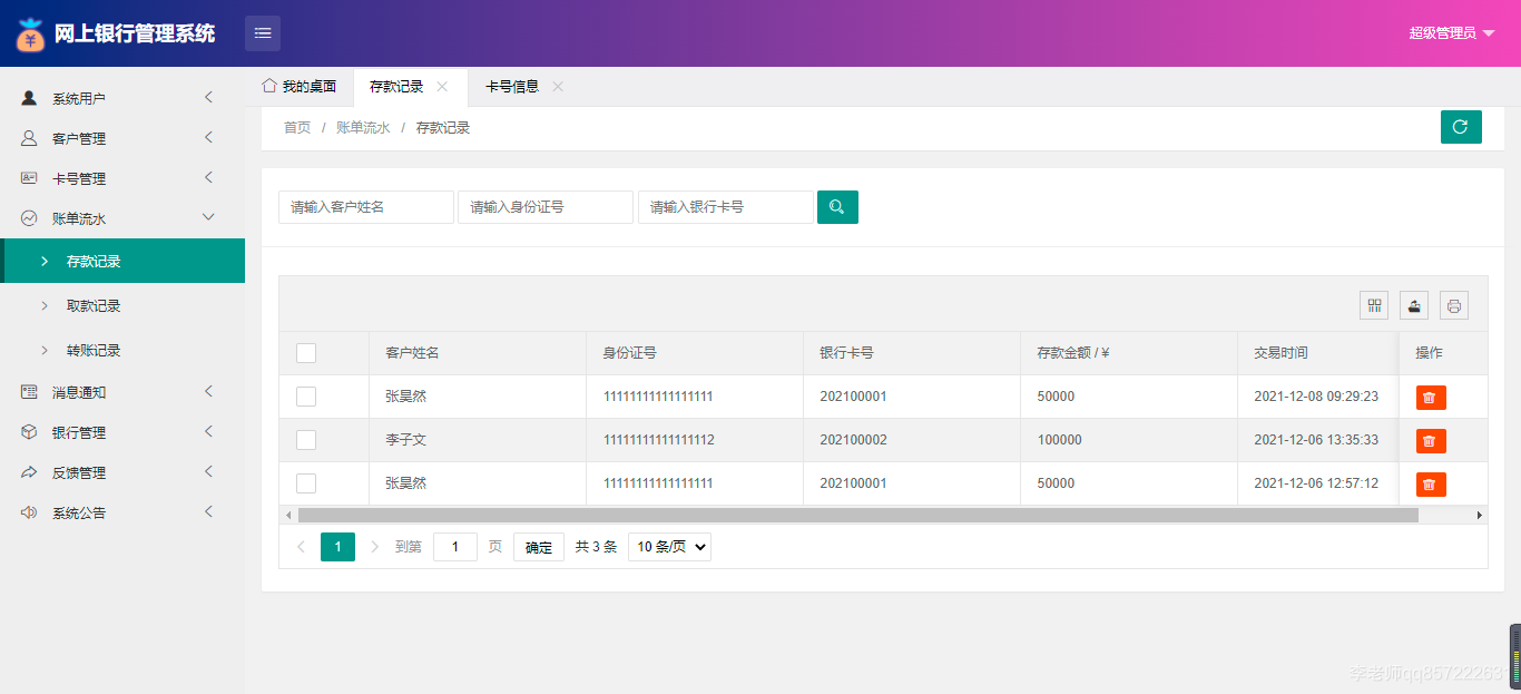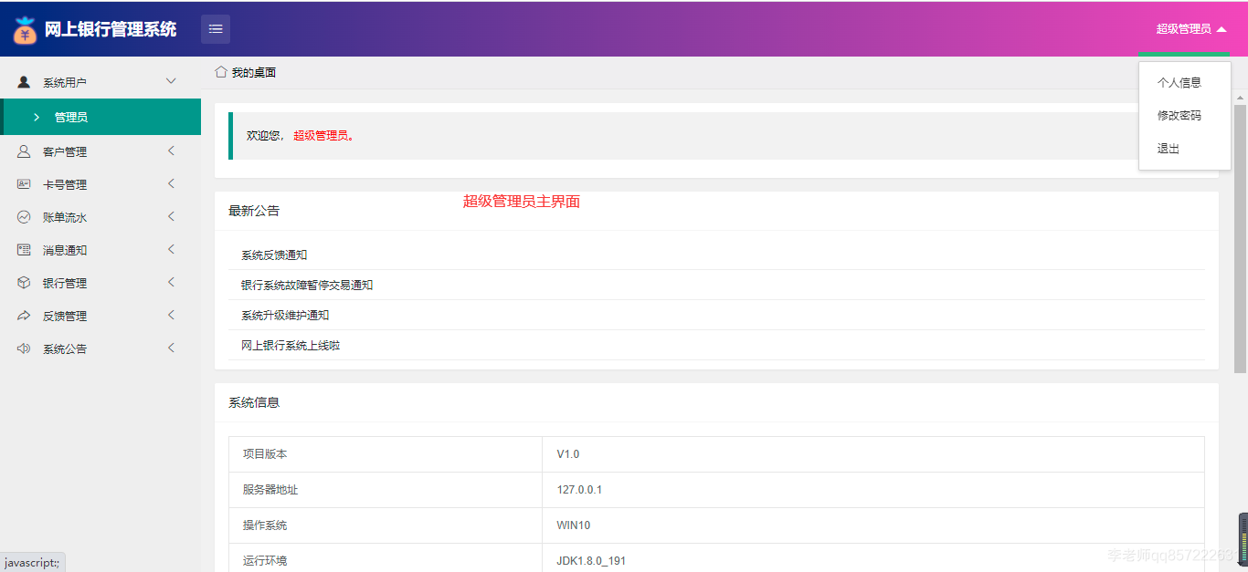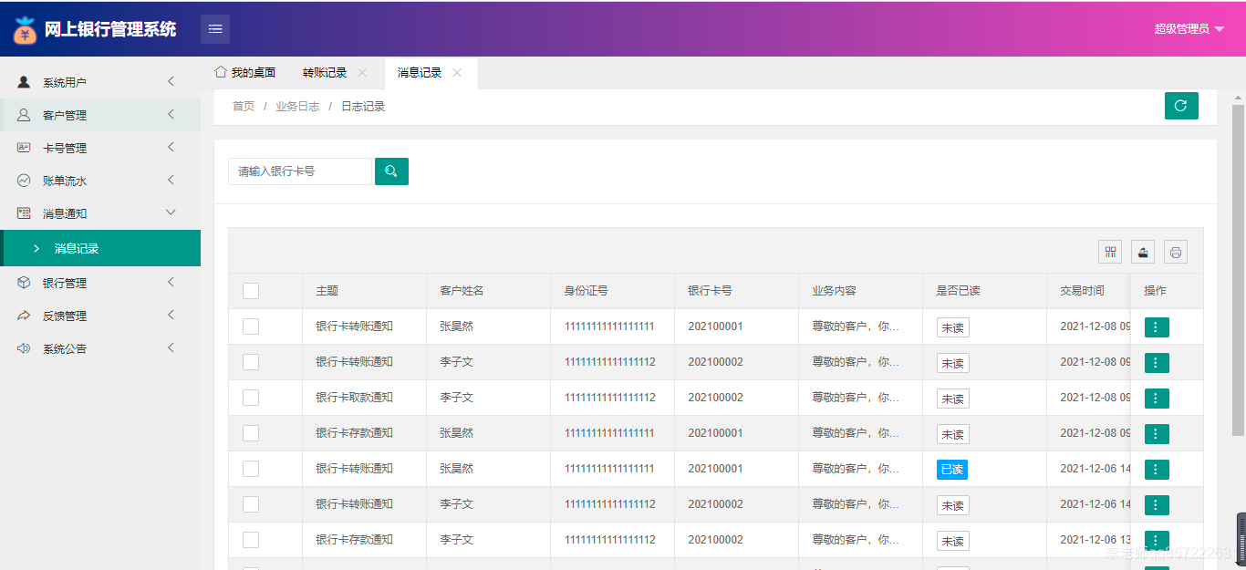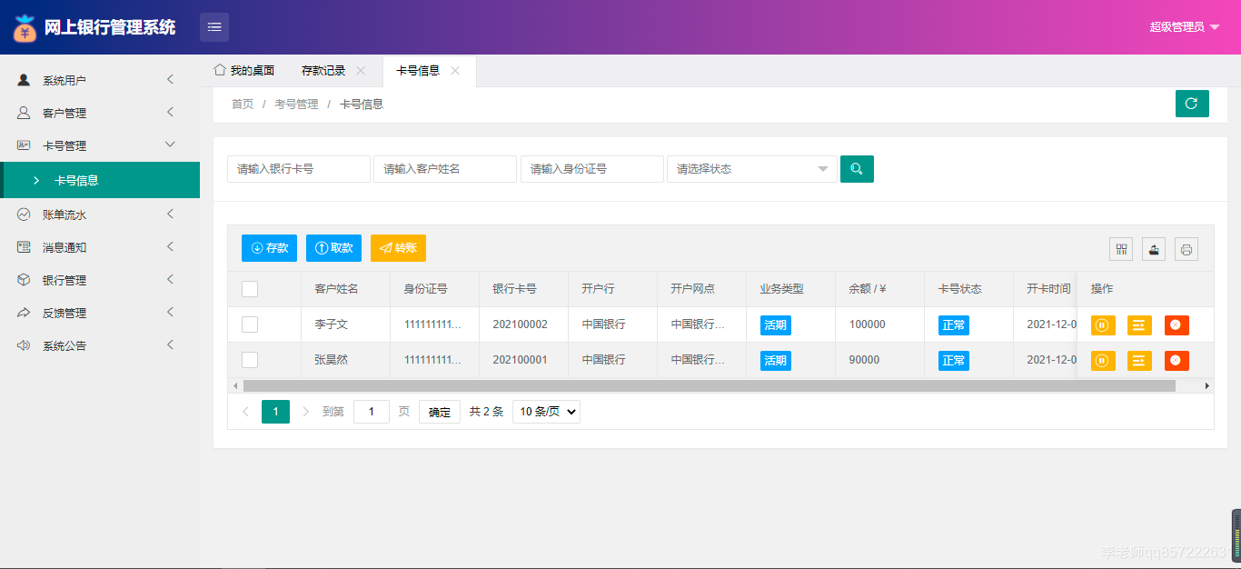 超级管理员:管理员管理;客户管理;卡号管理(存款、取款、转账);账单流水管理;消息通知;银行管理;反馈管理;系统公告;个人信息修改;密码修改。