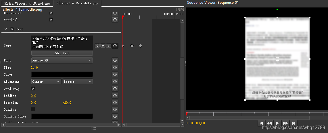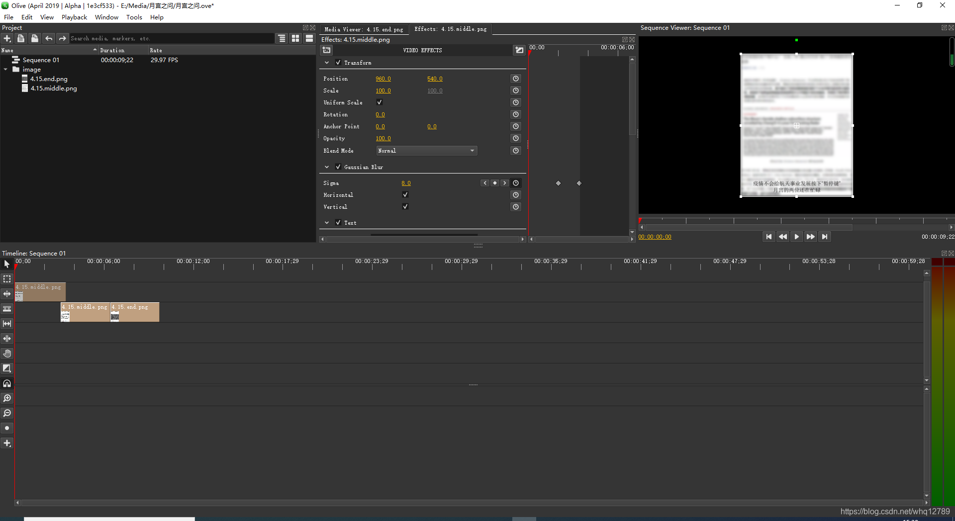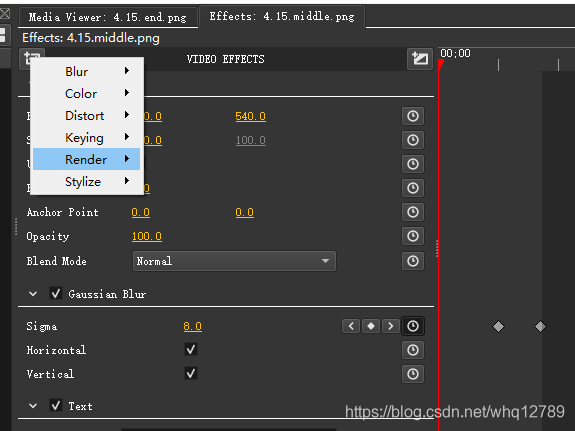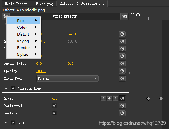 点击时间线中的视频片段,中上部的Effects窗口可以加模糊等效果,这里选择Gaussian Blur(高斯模糊)