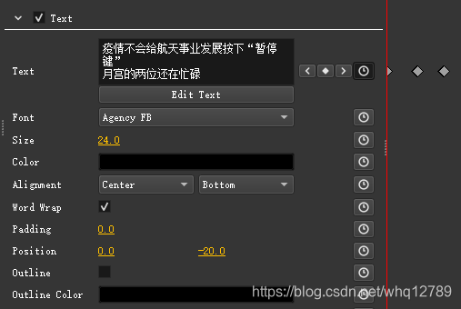 文字可以设置Text内容、Font字体、Size尺寸、Color颜色、Alignment对齐方式(左右对齐、上下对齐)、Position位置等信息