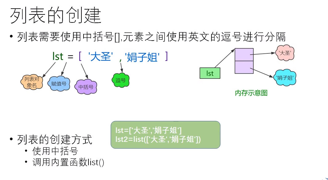 print(lst)#第二种方式内置函数函数list()lst1 = list['nice','to','meet','you'] #错误写法 不是list[]