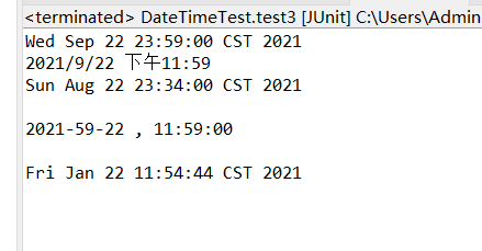 //		解析String str1 = 	"2021-54-22 , 11:54:44";Date date3 = sdf1.parse(str1);System.out.println(date3);}结果: